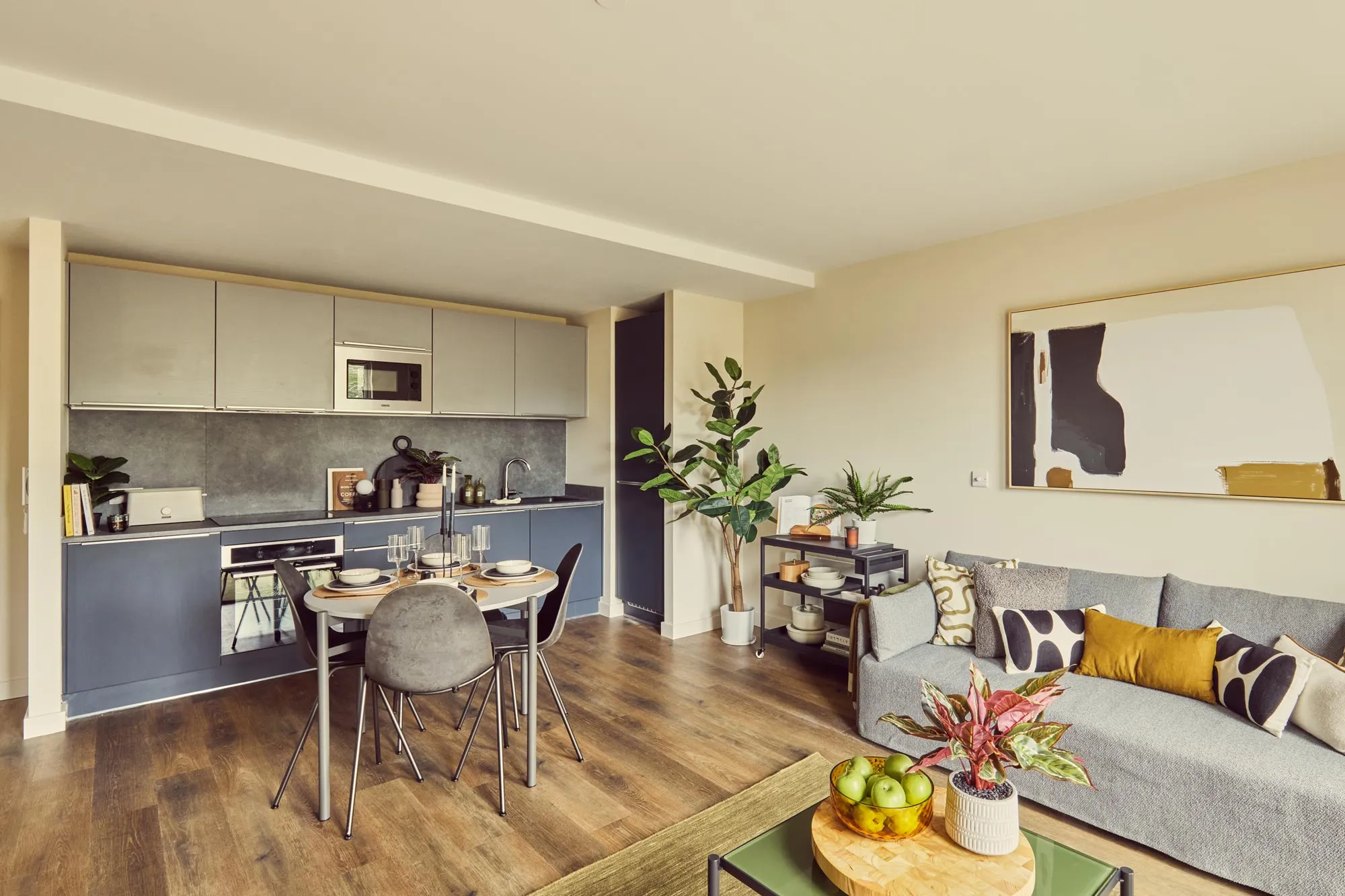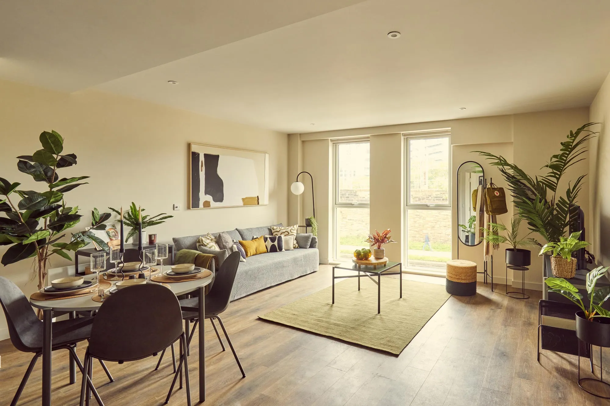 Our spacious living area comes all set with designer furniture, ready for you to get going from the very start. Floor-to-ceiling windows flood the space with light. The bespoke furniture includes a Roger Lewis sofa, coffee table, TV unit with storage, dining table, & Mater dining chairs.