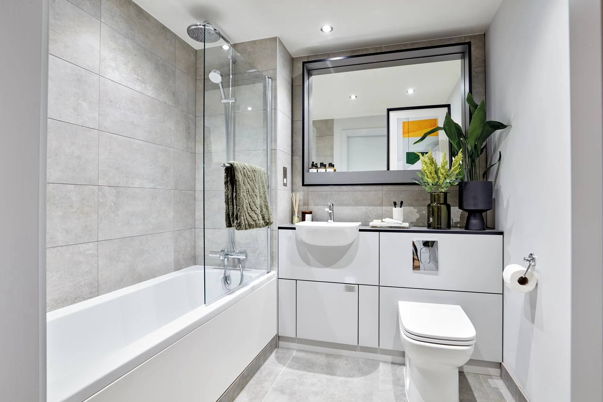 Each bathroom features a wash basin, toilet and shower-over-bath with plenty of stylish finishes – like a large mirror that doubles as a floating cabinet to keep everything looking nice and tidy.